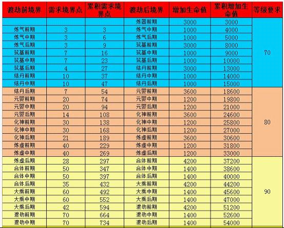90级之前,玩家从70级升到90级大约需要1个月的时间(非R)。那么在这一个月的时间内玩家普遍能获得的境界点是多少呢?我们以平均每天15点境界点来计算,那么一个月所得境界点大约为15*30=450点。那么要如何分配这420点境界点呢?我们先来看一下渡劫数据表。