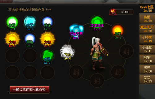 改版后的27个命格见下表!(初始级别为一级!)可升级!黄色>紫色>蓝色>绿色! 黄色可以吃紫色蓝色绿色升级! 紫色吃蓝色绿色升级! 蓝色只能吃绿色升级!另外有一个是比较特殊的是红色的,叫太初。所有的都可以吃掉太初增加1200点经验。 玩家根据自己等级最多可带8个命格!等级越高可带的命格越多!